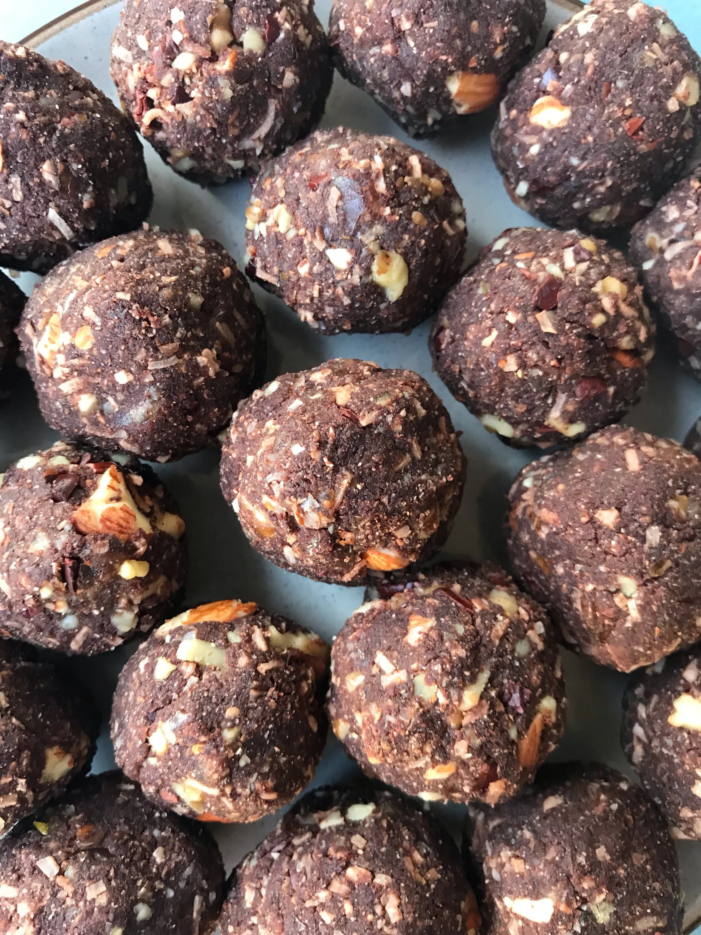 Boil water in a kettle and soak dates and chia seeds. Pulse nuts in a food processor until broken into smaller pieces. Add the dry ingredients and pulse. Slowly add drained dates a few at a time to the dry mixture along with the wet ingredients. Last, add the cacao nibs and pulse once or mix by hand so that the nibs maintain their shape and texture. If the balls are too dry, add a small amount of water and pulse again. Roll into 1” balls and place on baking pan in the fridge or freezer to set. Store in an airtight container for up to 2 weeks in the fridge.